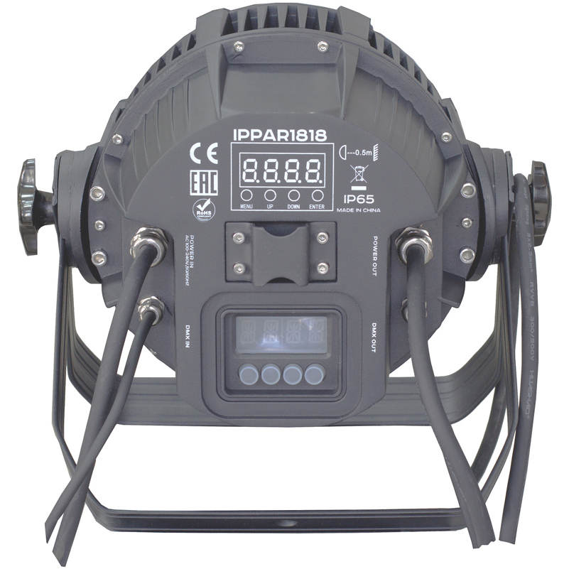 Akkumulátoros kültéri (IP65), W-DMX-es PAR lámpa, 4db RGBWA+UV LED-del, IR távirányítóval, mobilapplikációs vezérléssel moduláris kompakt házban