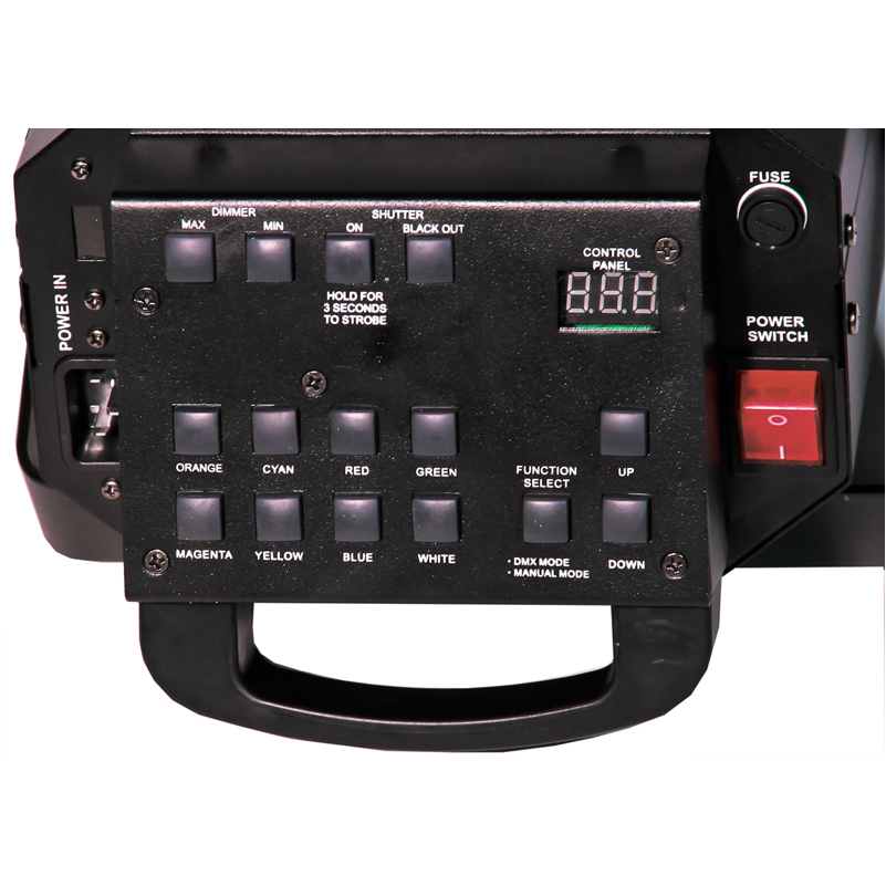 – Vezérlés: hátlapi kezelő felület, DMX